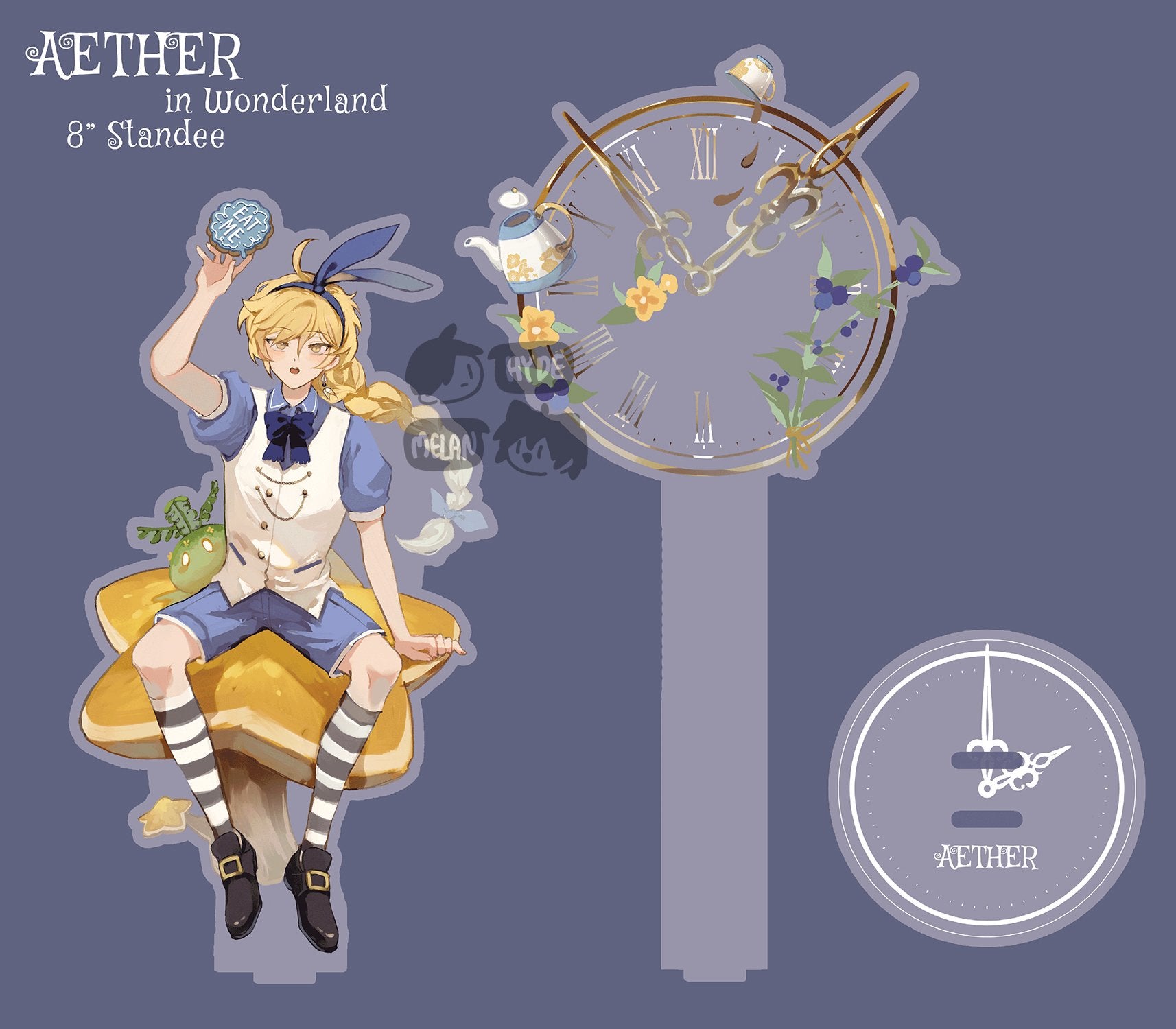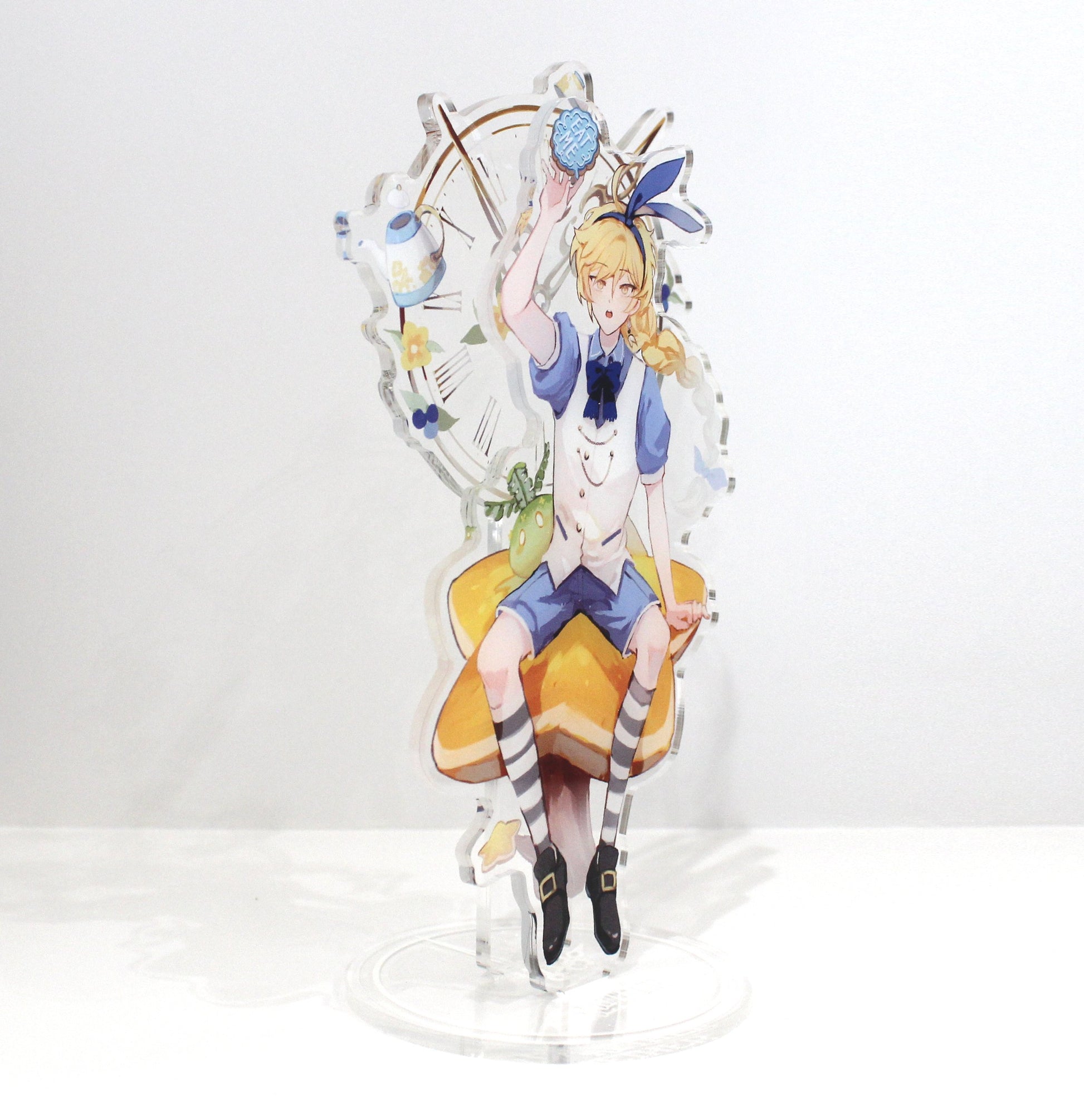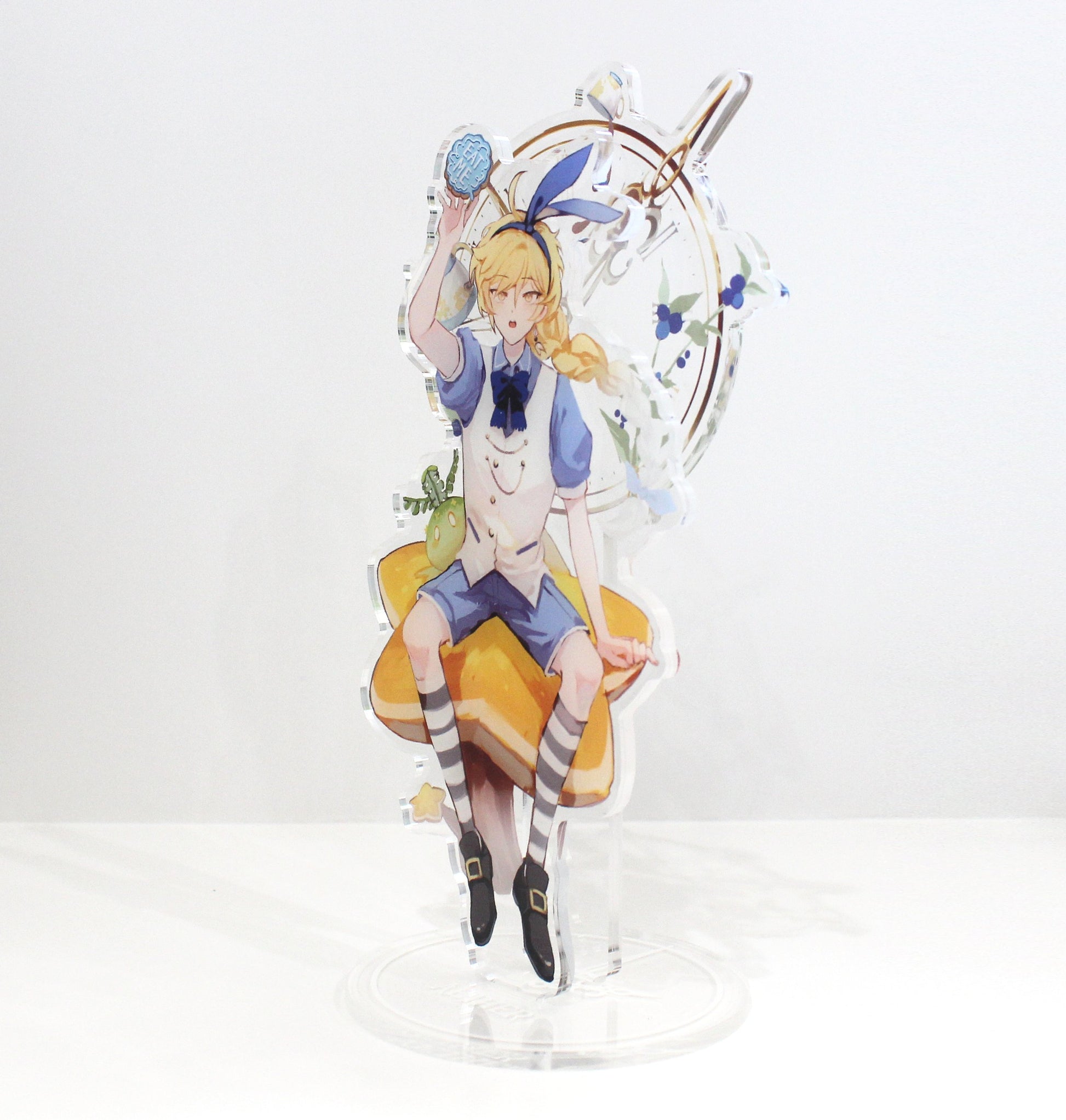 This listing is for a 3-piece acrylic standee of Aether in an AU outfit based off of the Alice in Wonderland crossover from Genshin Impact. The background features a clear acrylic piece with a gold clock and small details from the game. It is professionally printed directly on durable CLEAR acrylic. Set includes 1 base and 2 standing pieces.
