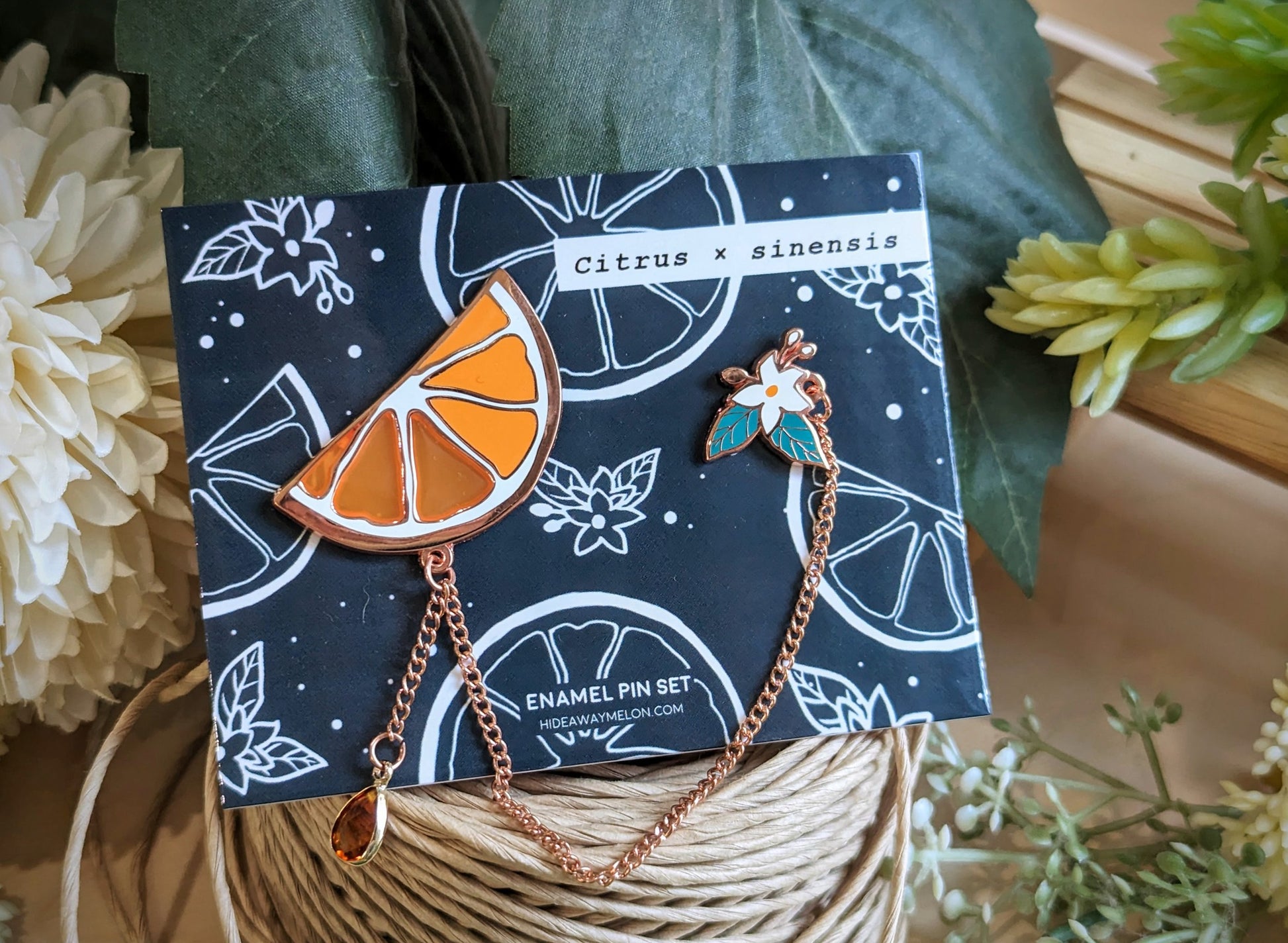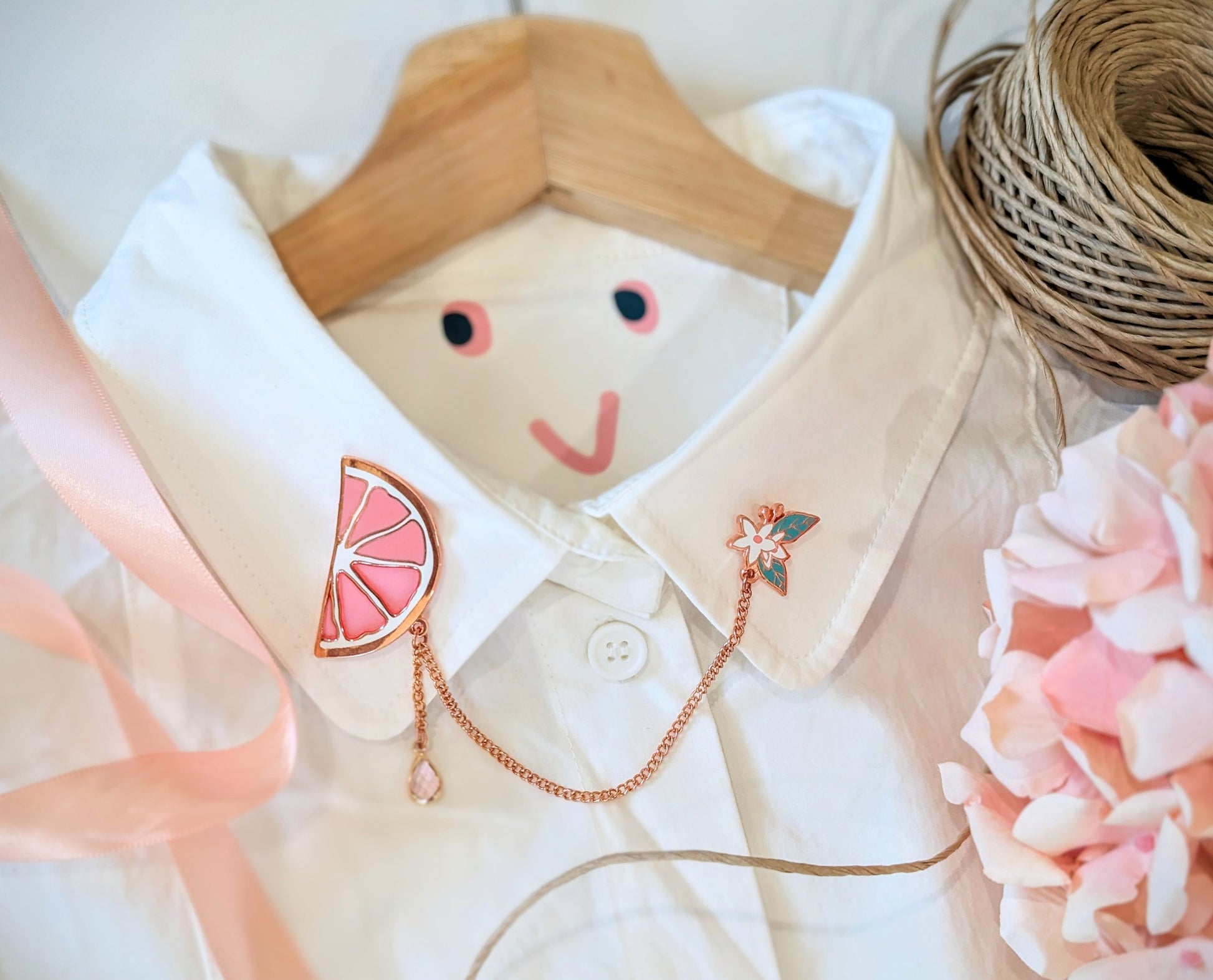 Introducing our hard enamel Citrus Dual Collar Pins, an accessory that adds a touch of zest to your outfit :-) The "fruit slice" side of the pin is crafted with transparent enamel that gives the pins a stained glass look! Each set of pins is adorned by a dangling chain with a matching glass bead.
