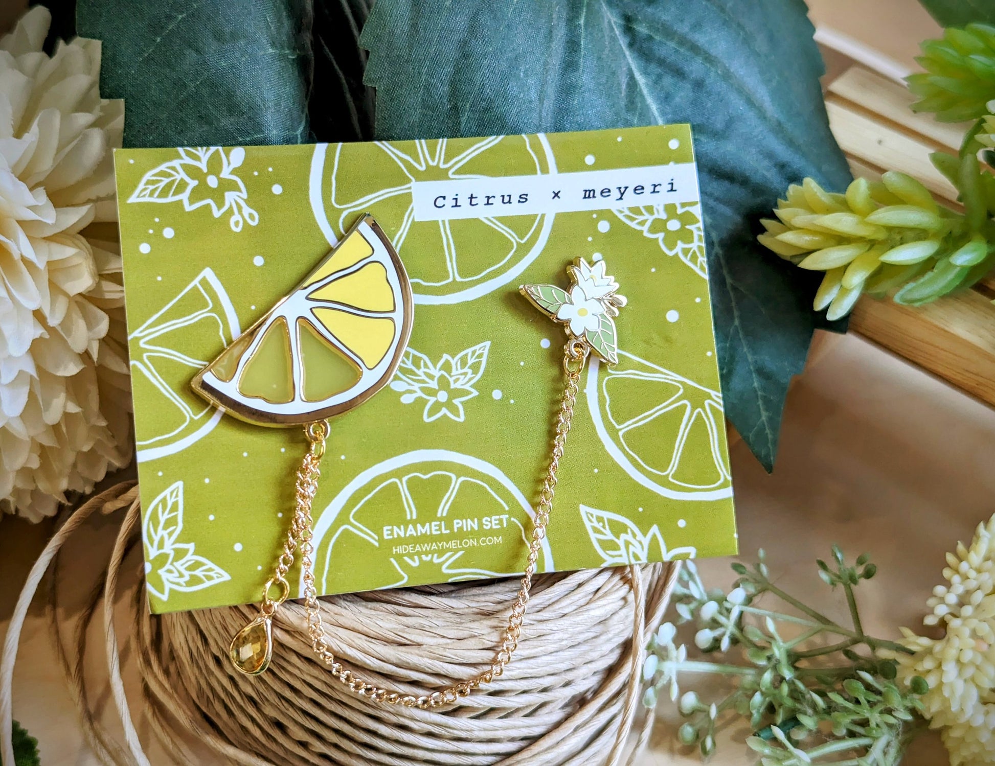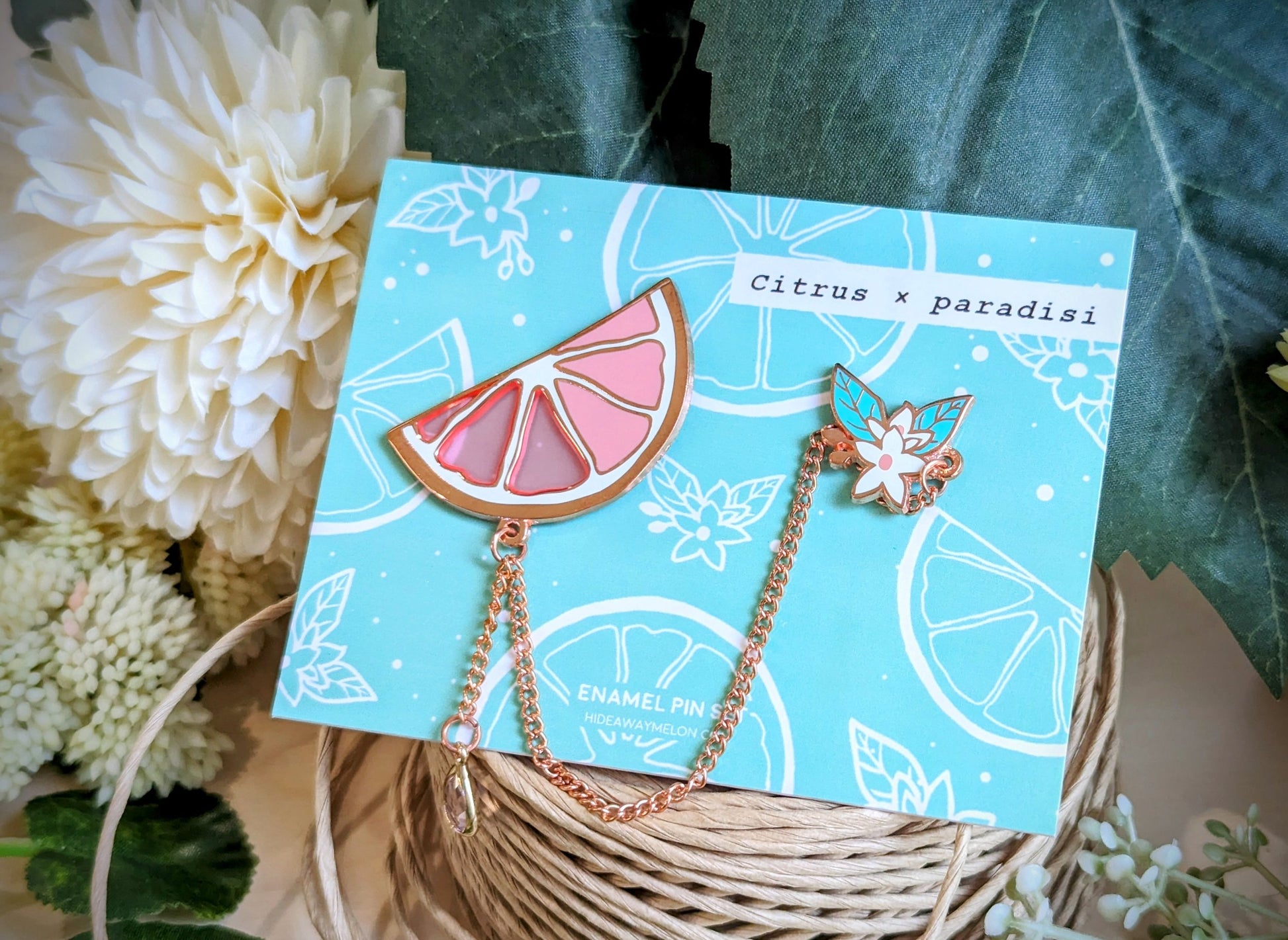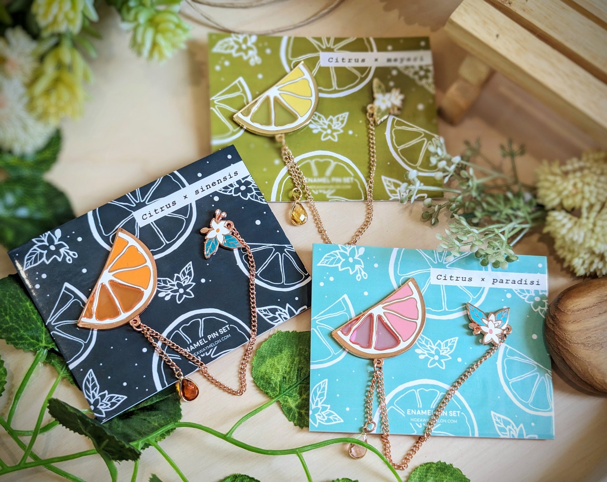 Citrus Dual Collar (Hard Enamel) Pins Set - Orange, Lemon, Pink Grapefruit