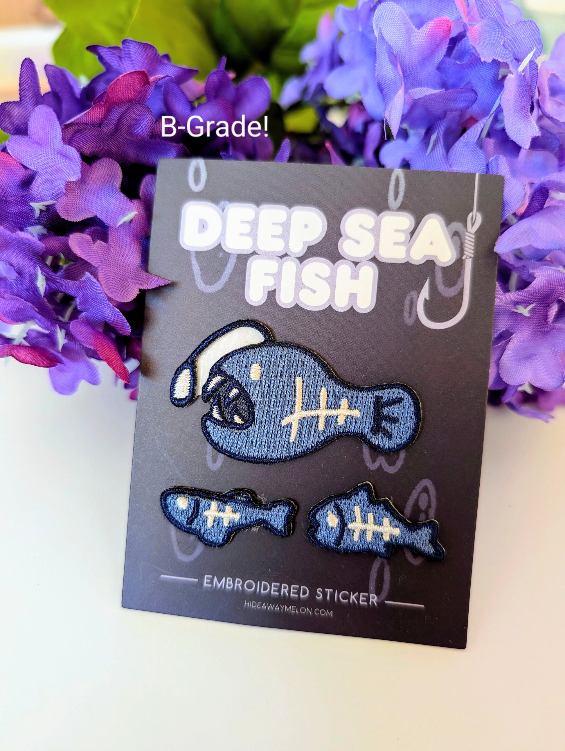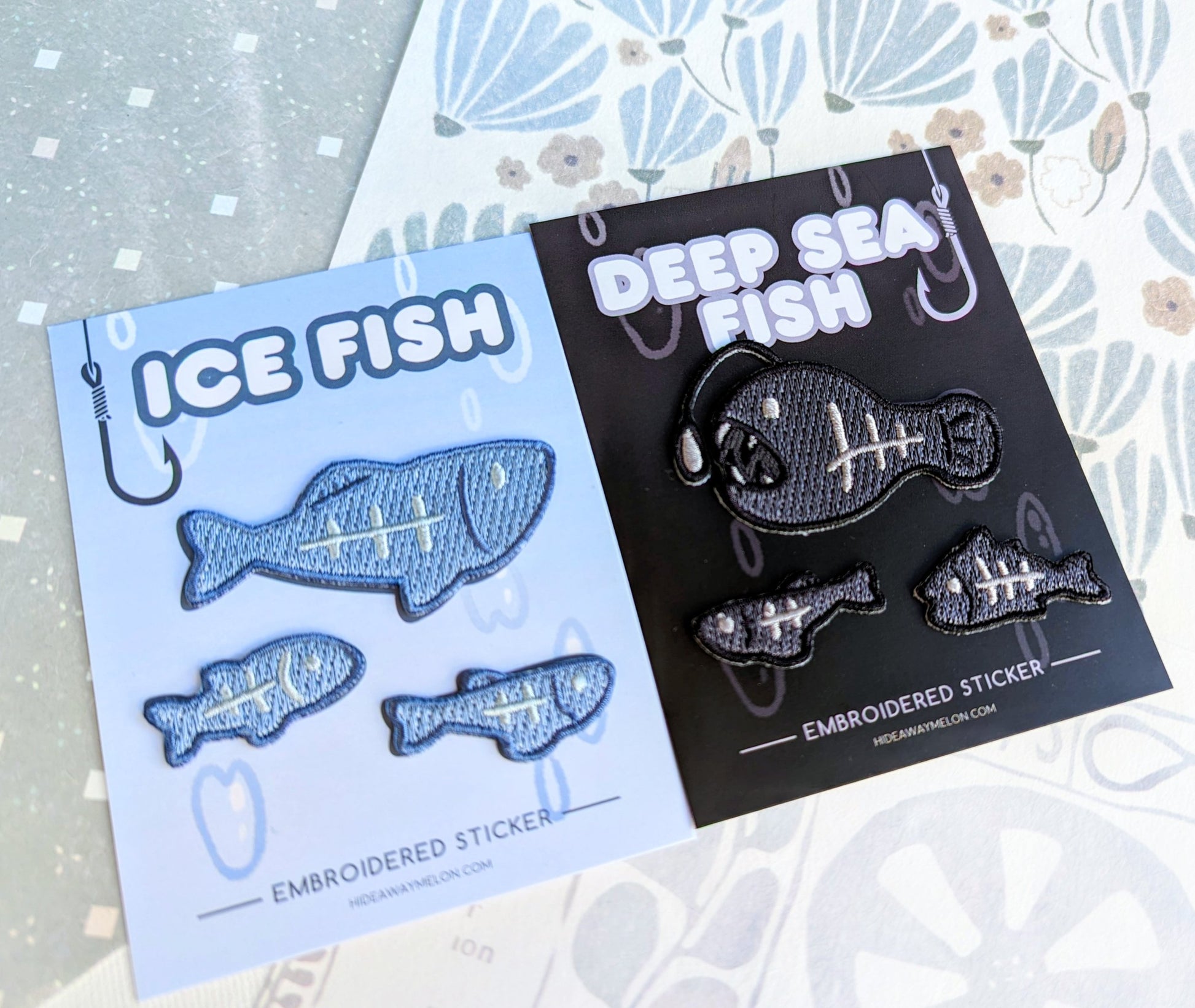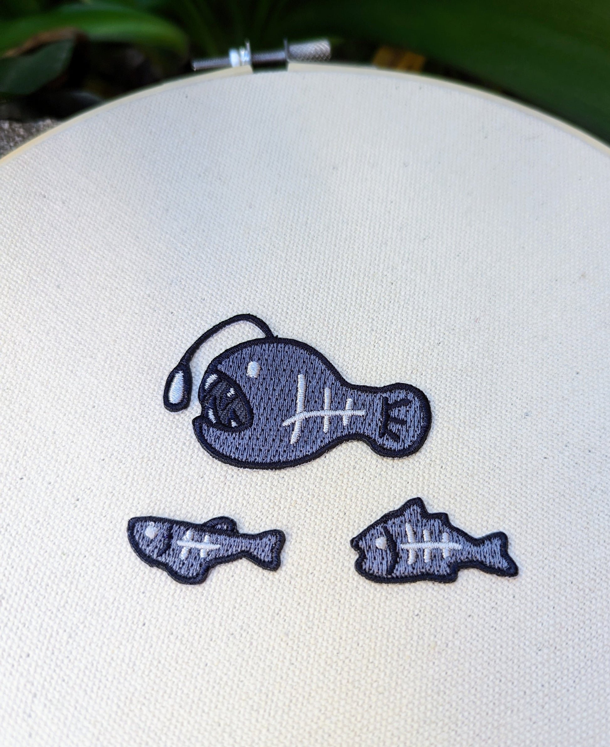 A set of 3 mini embroidered patches based on Melan's original deep sea fishing illustrations! They can be used as stickers, iron on patches, OR sewn on clothing.