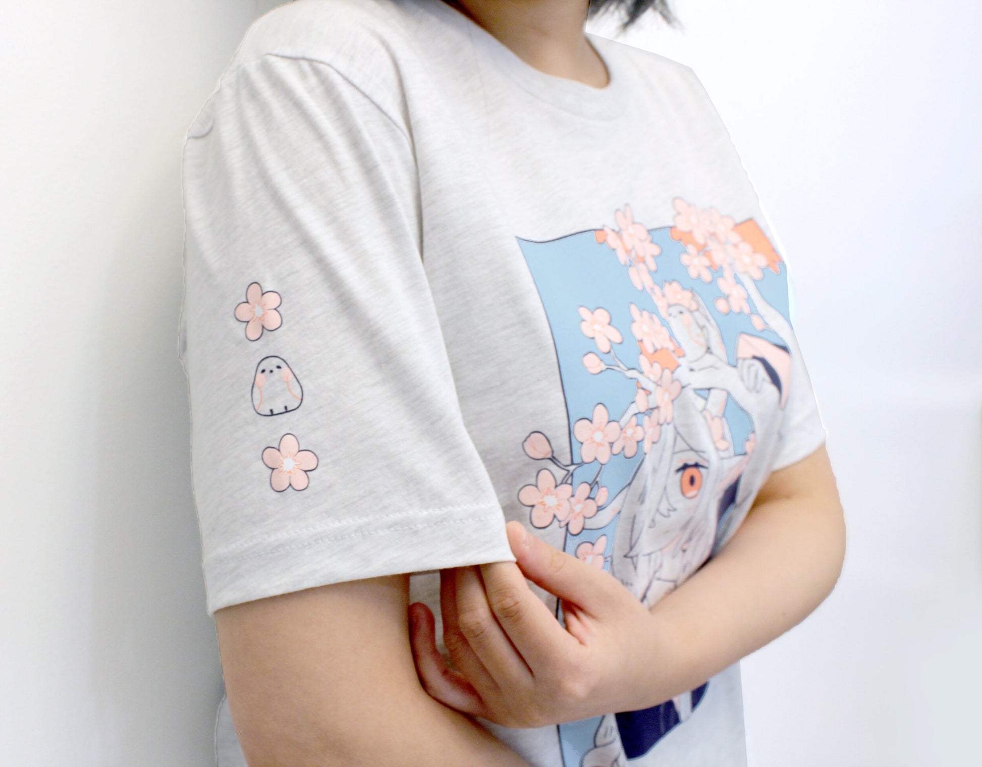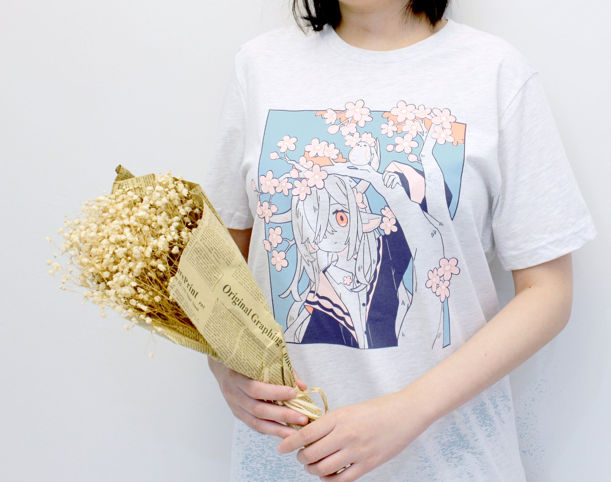 A heather grey t-shirt featuring our original character, a deer girl under a cherry blossom tree! The sleeve also has sakura flowers and a small bird screen printed on it.