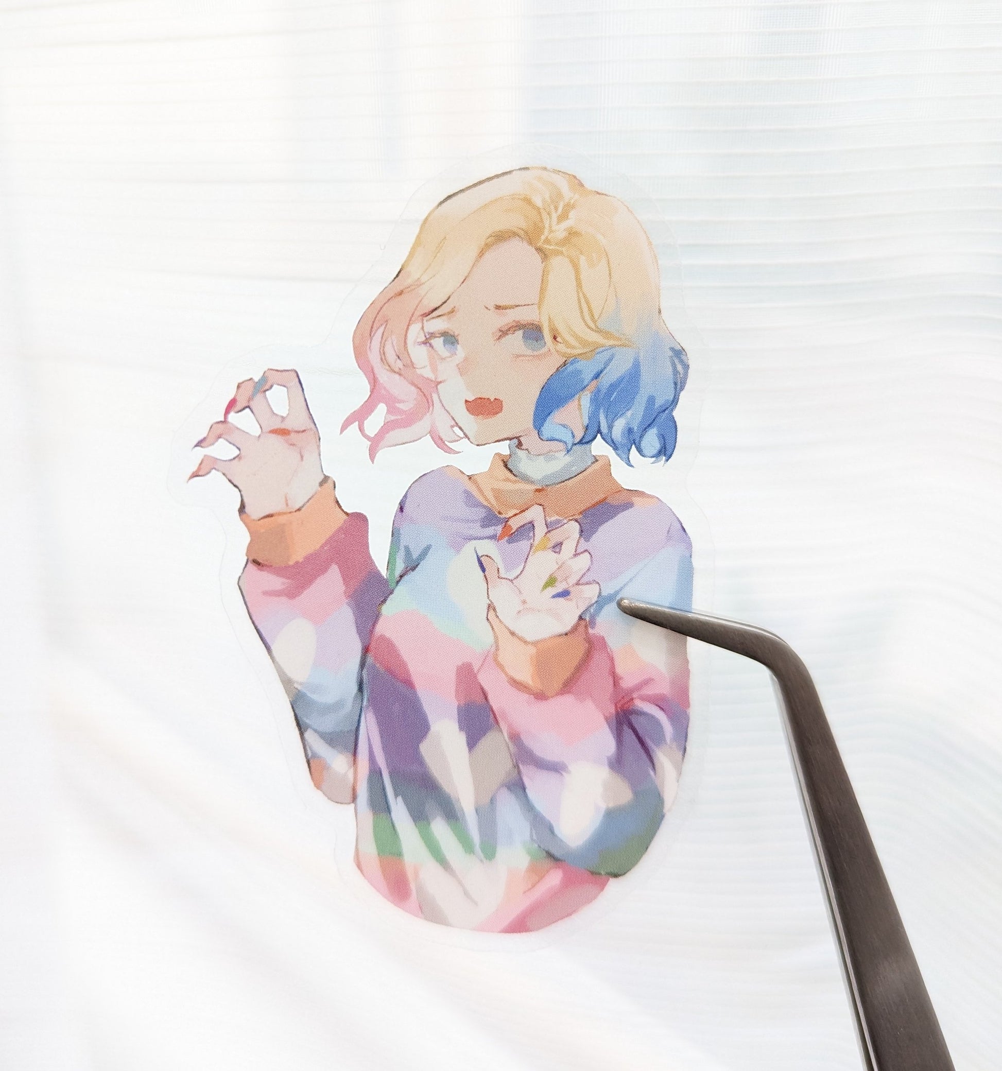This listing is for an individual 3" die cut sticker of Enid Sinclair from the show “Wednesdayâ€! Each sticker individually peels off with adhesive backing, printed on transparent vinyl.