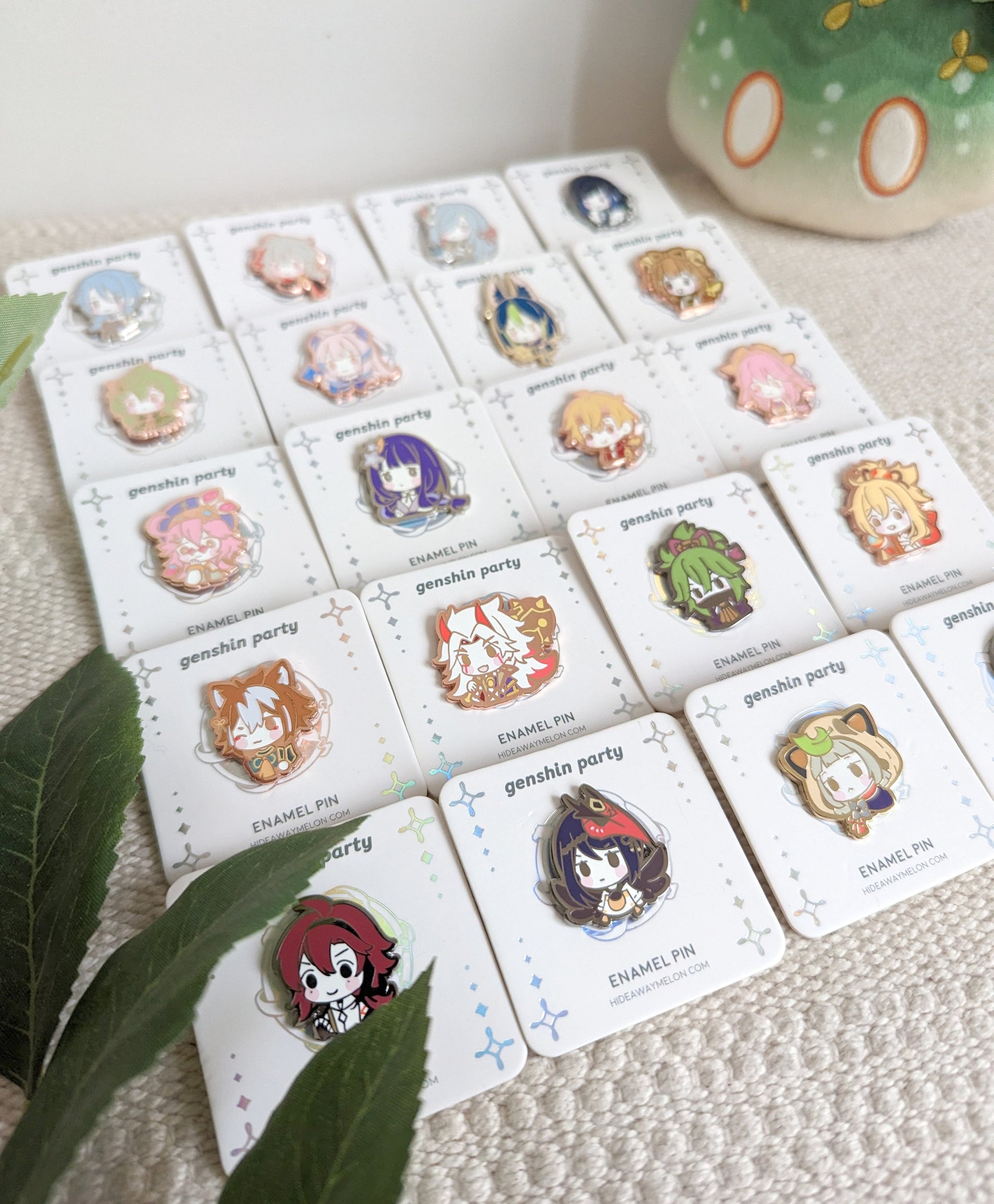 This listing is for a gacha/random hard enamel pin for one of 20 Genshin Impact characters from the app game. They are super small and cute 0.75†pins.