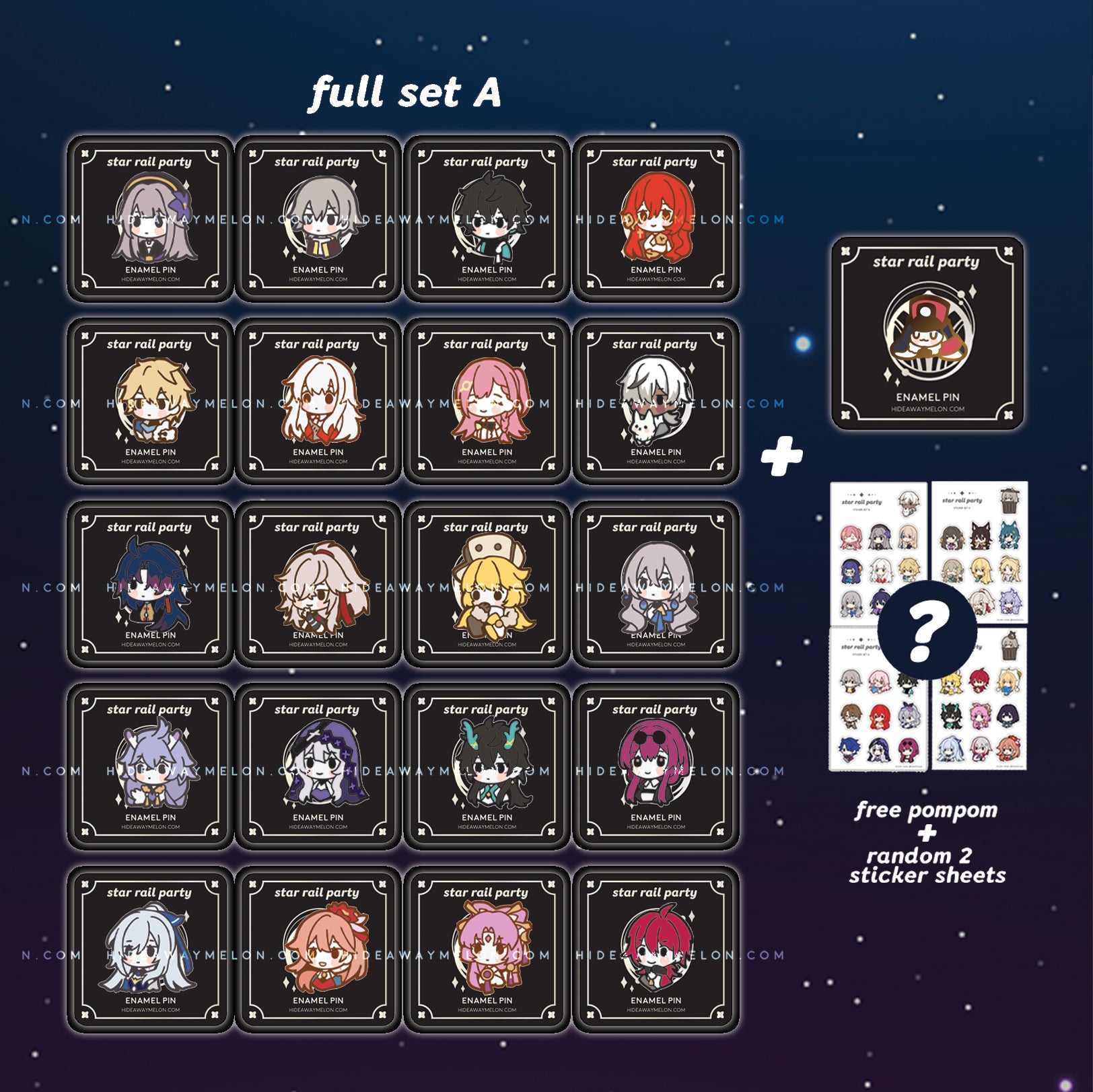 Ordering the full set A (20 characters) will include a free extra small 0.5" Pom-Pom pin + 2 random sticker sheets!