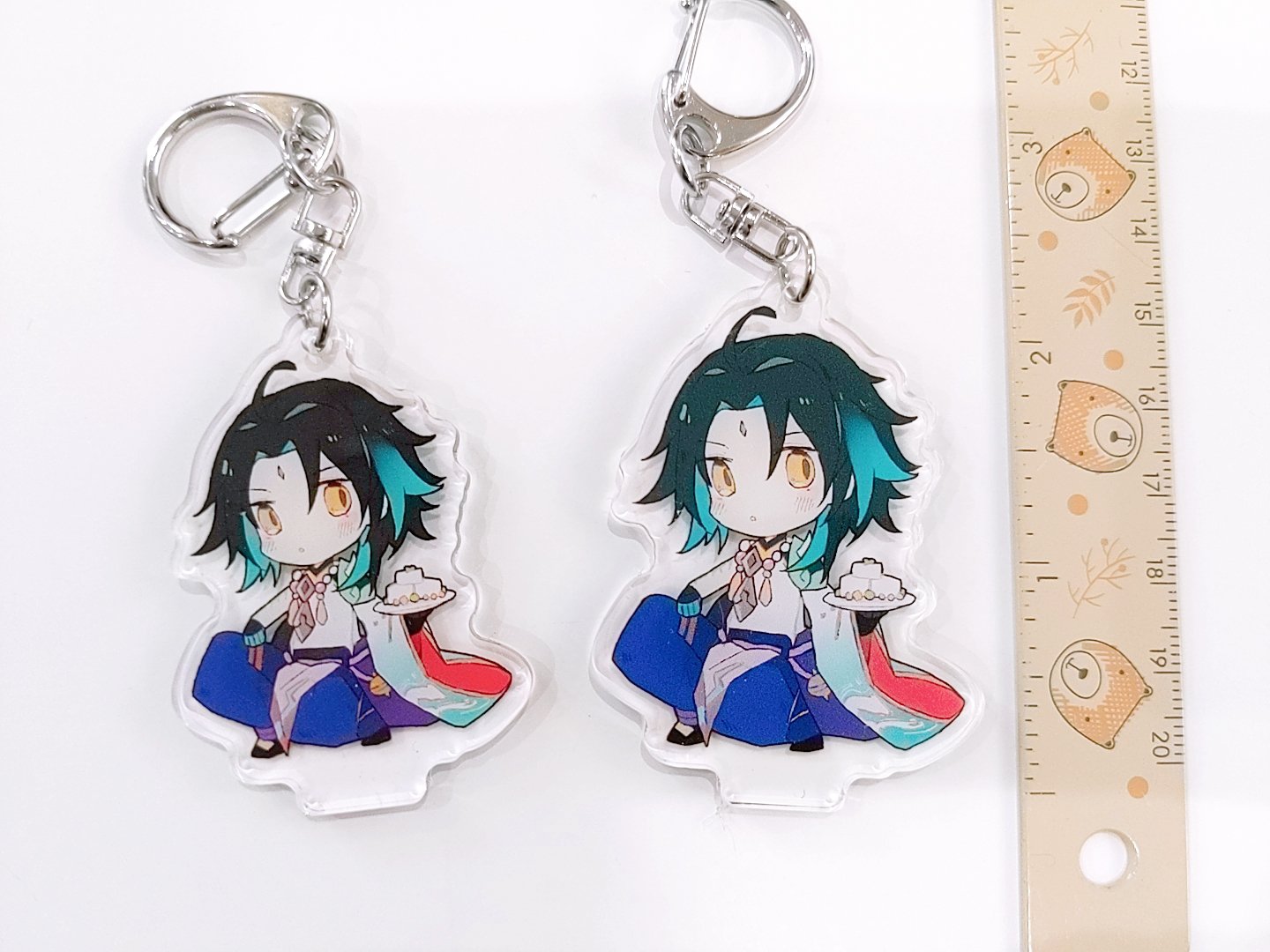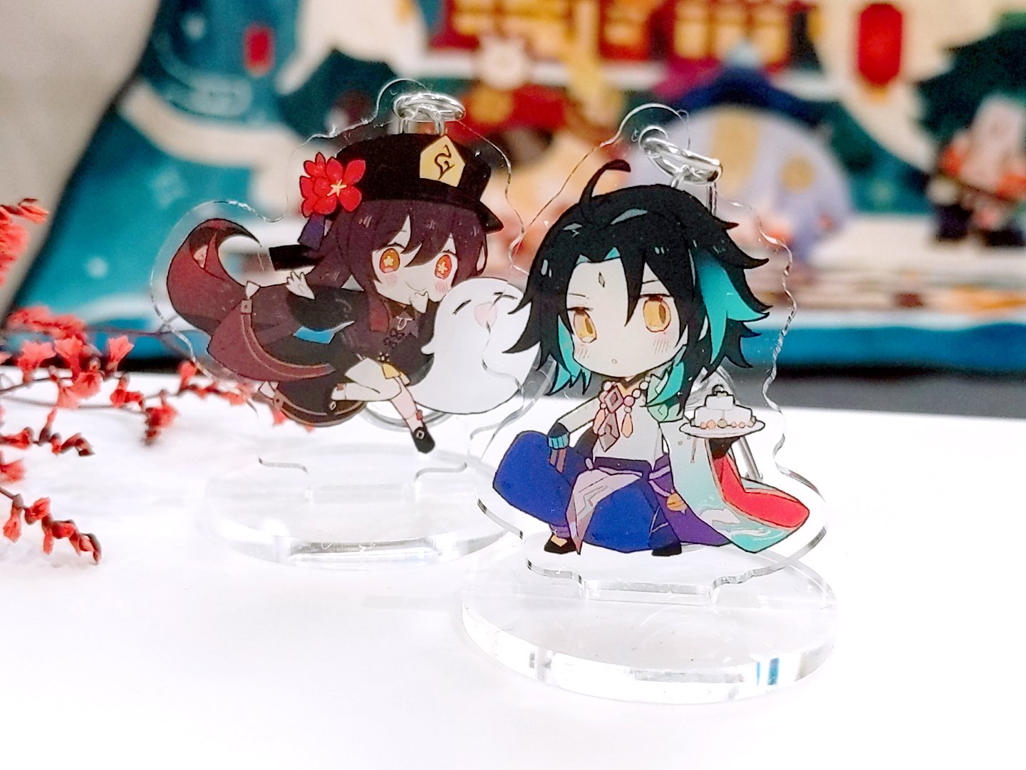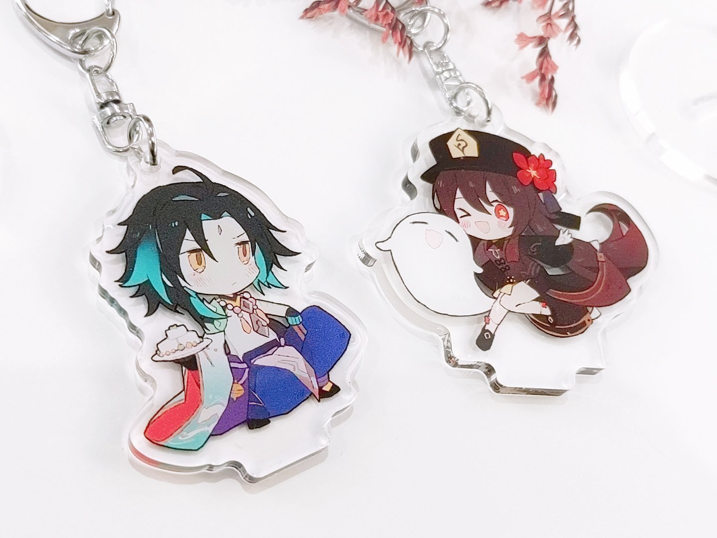 This listing is for a reversible keychain of Xiao from Genshin Impact! The two sides feature a different expression. Each charm is professionally printed on durable clear acrylic and comes with an acrylic base for standing the character on!