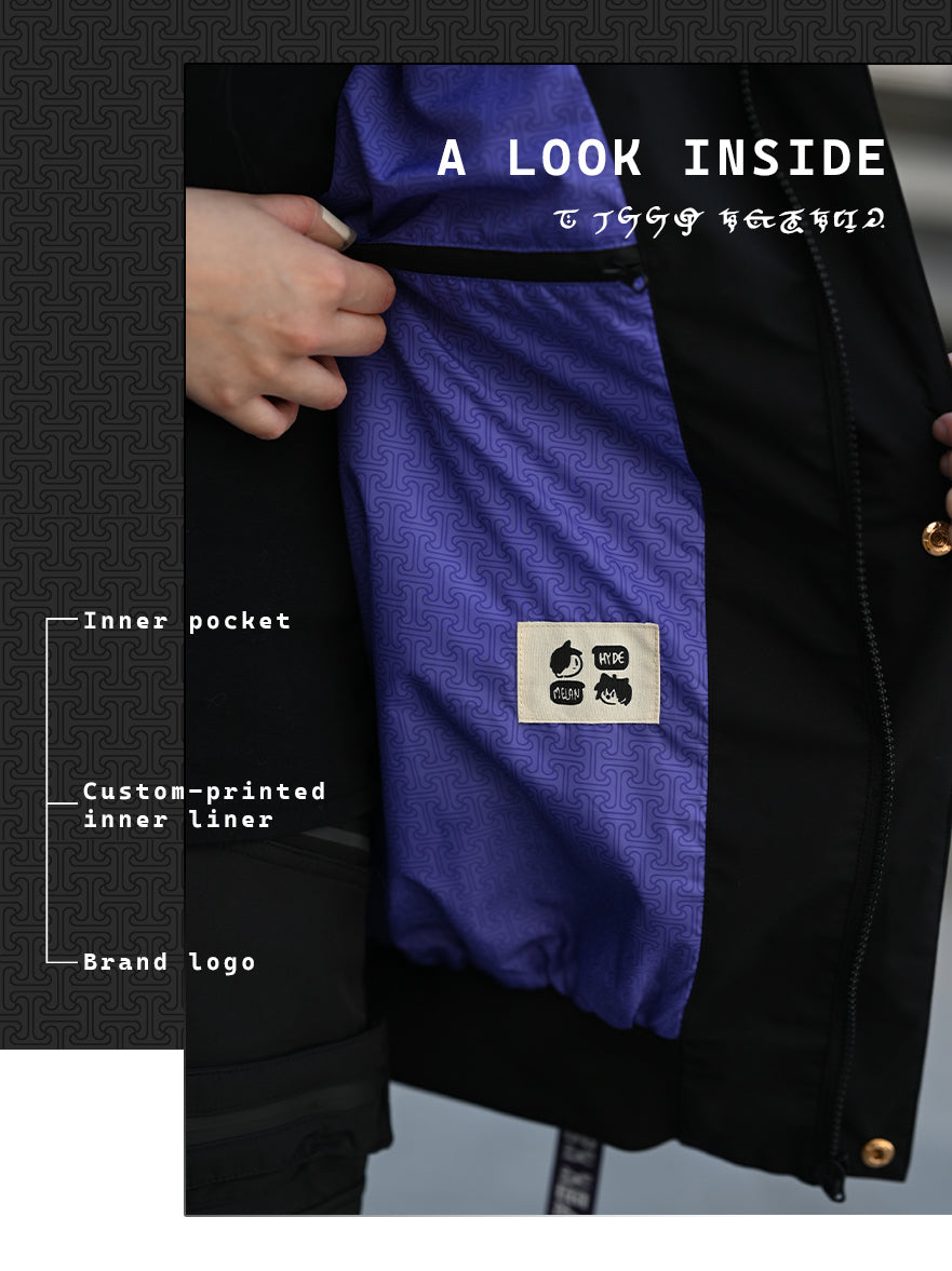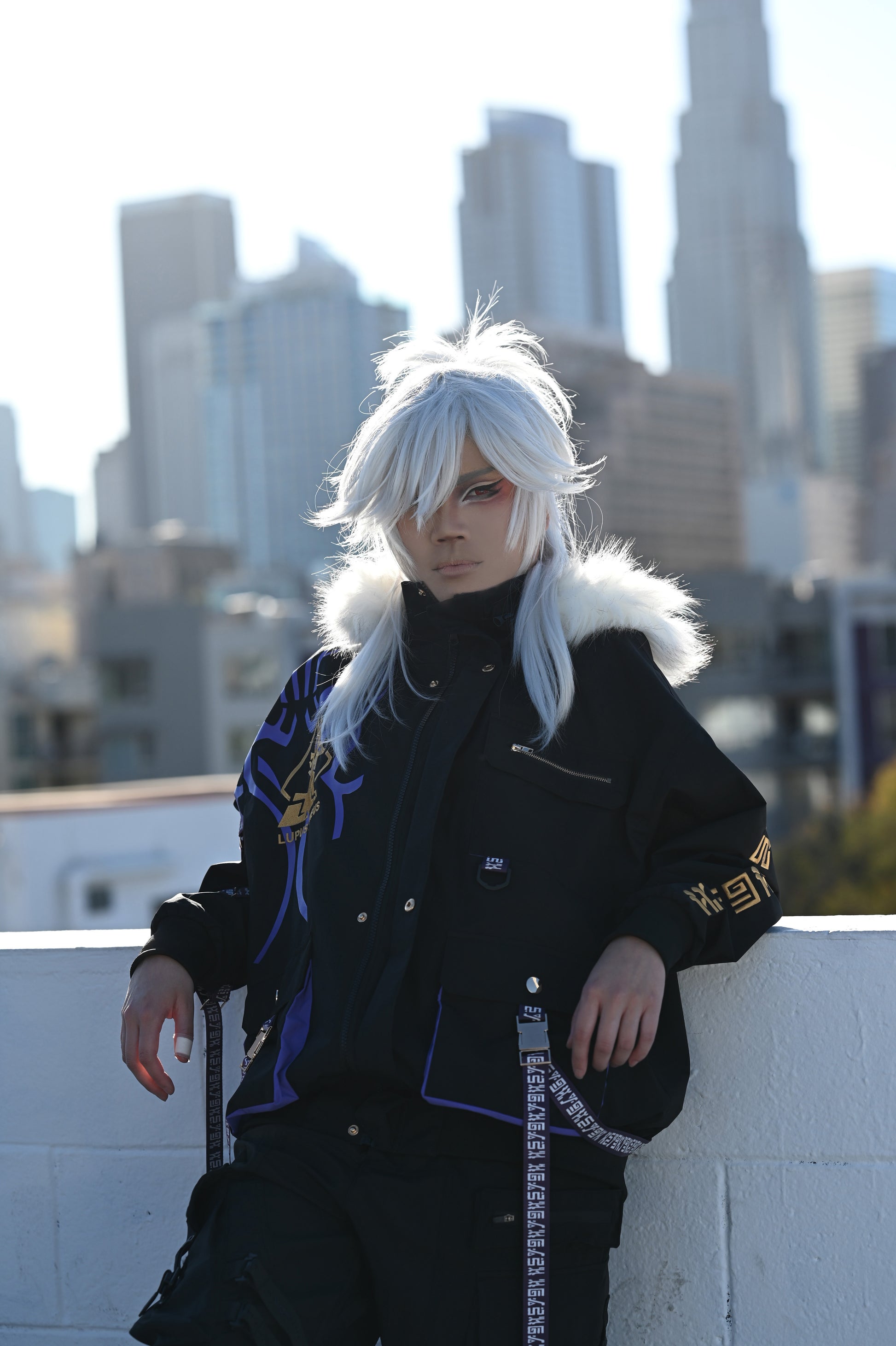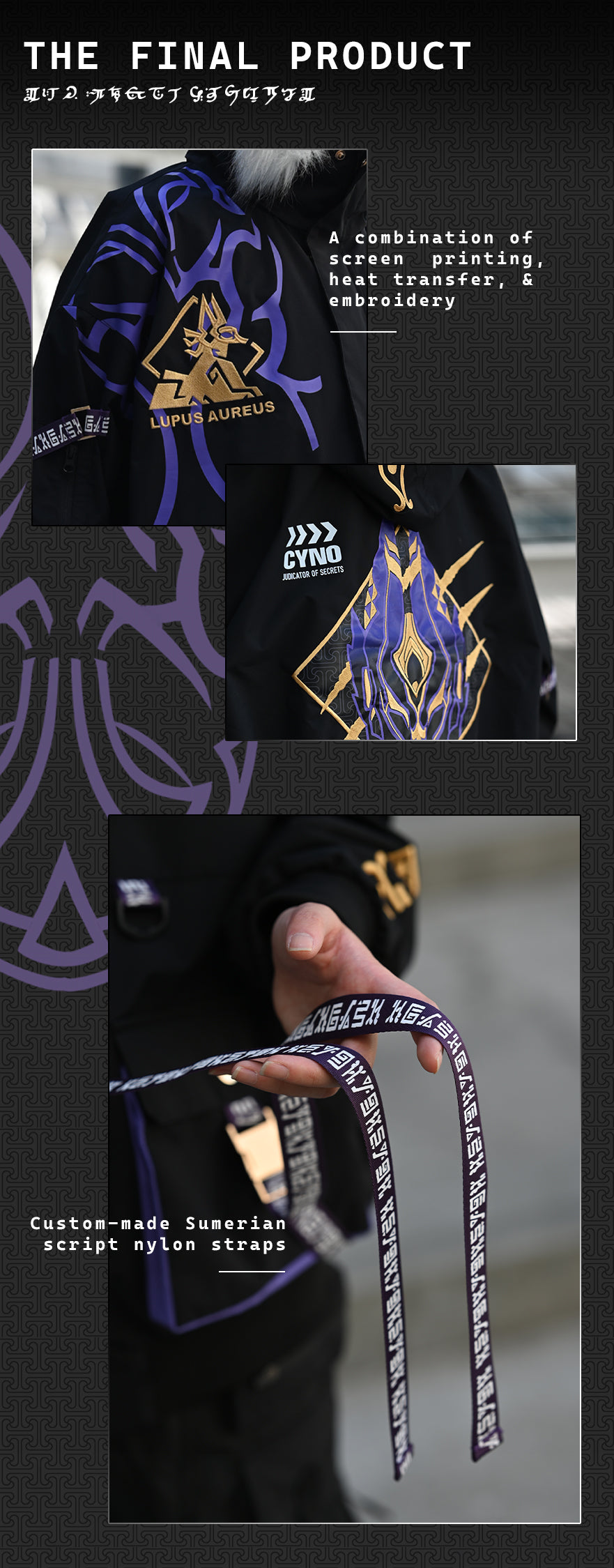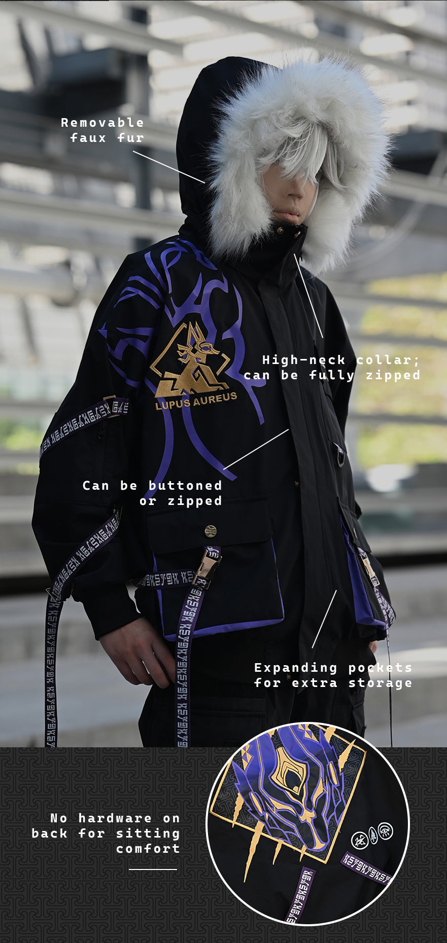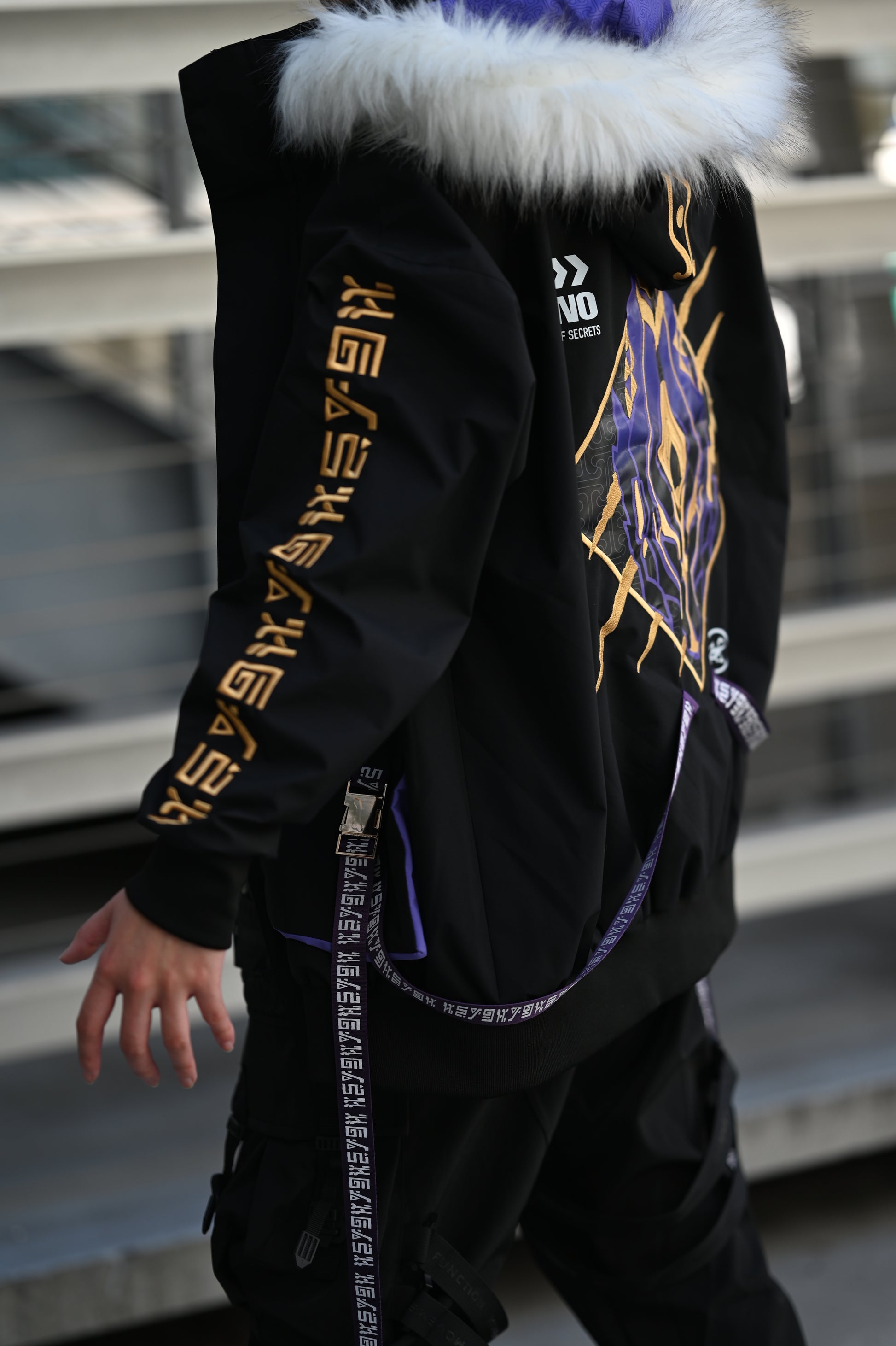 Channeling Cyno's commanding presence, this black techwear parka blends sleek functionality with bold design. It features multiple utility pockets, intricate embroidery and screen-printing inspired by Cyno's motifs, plus a hidden hood and removable faux fur for versatile styling in any environment.