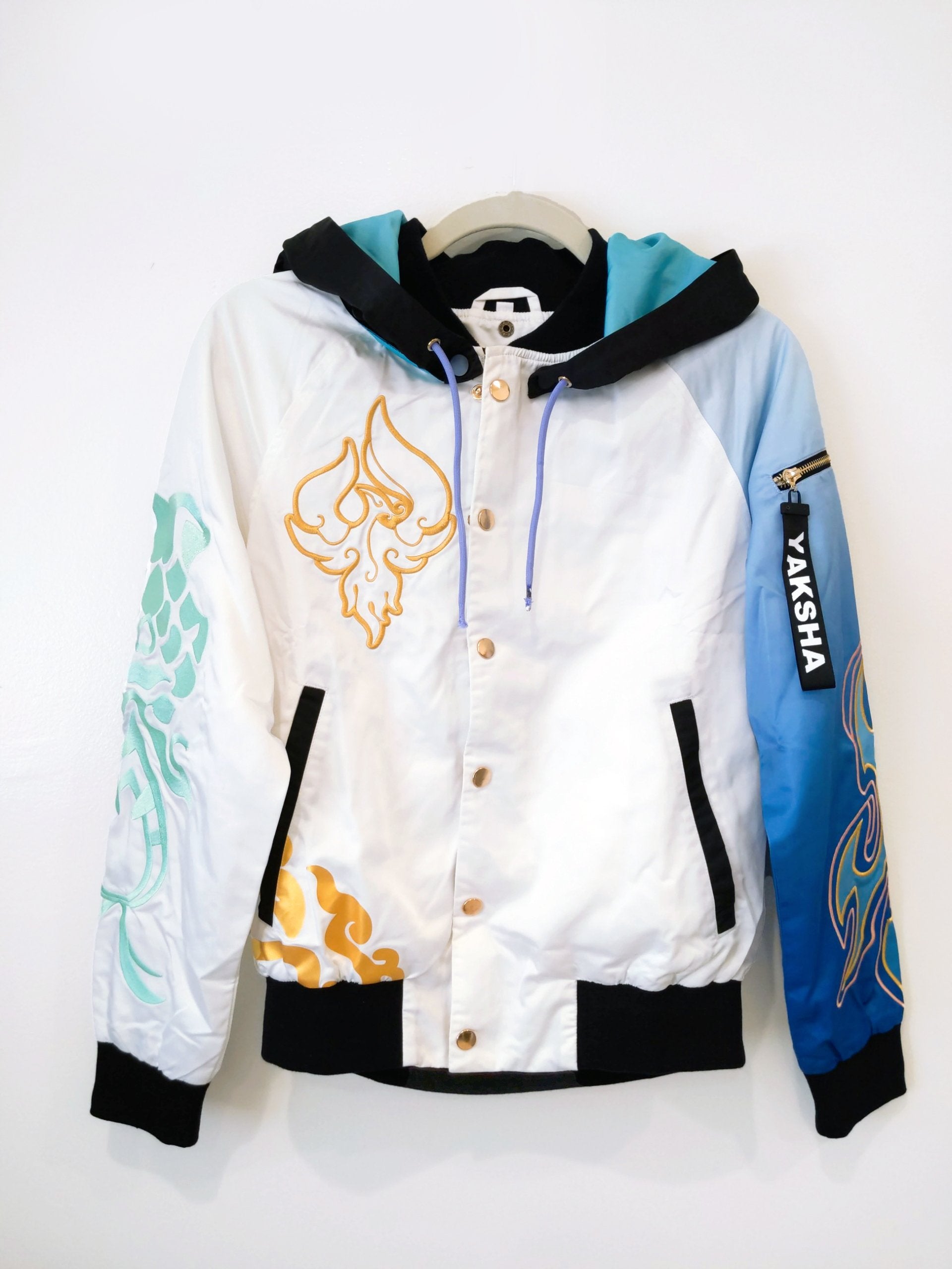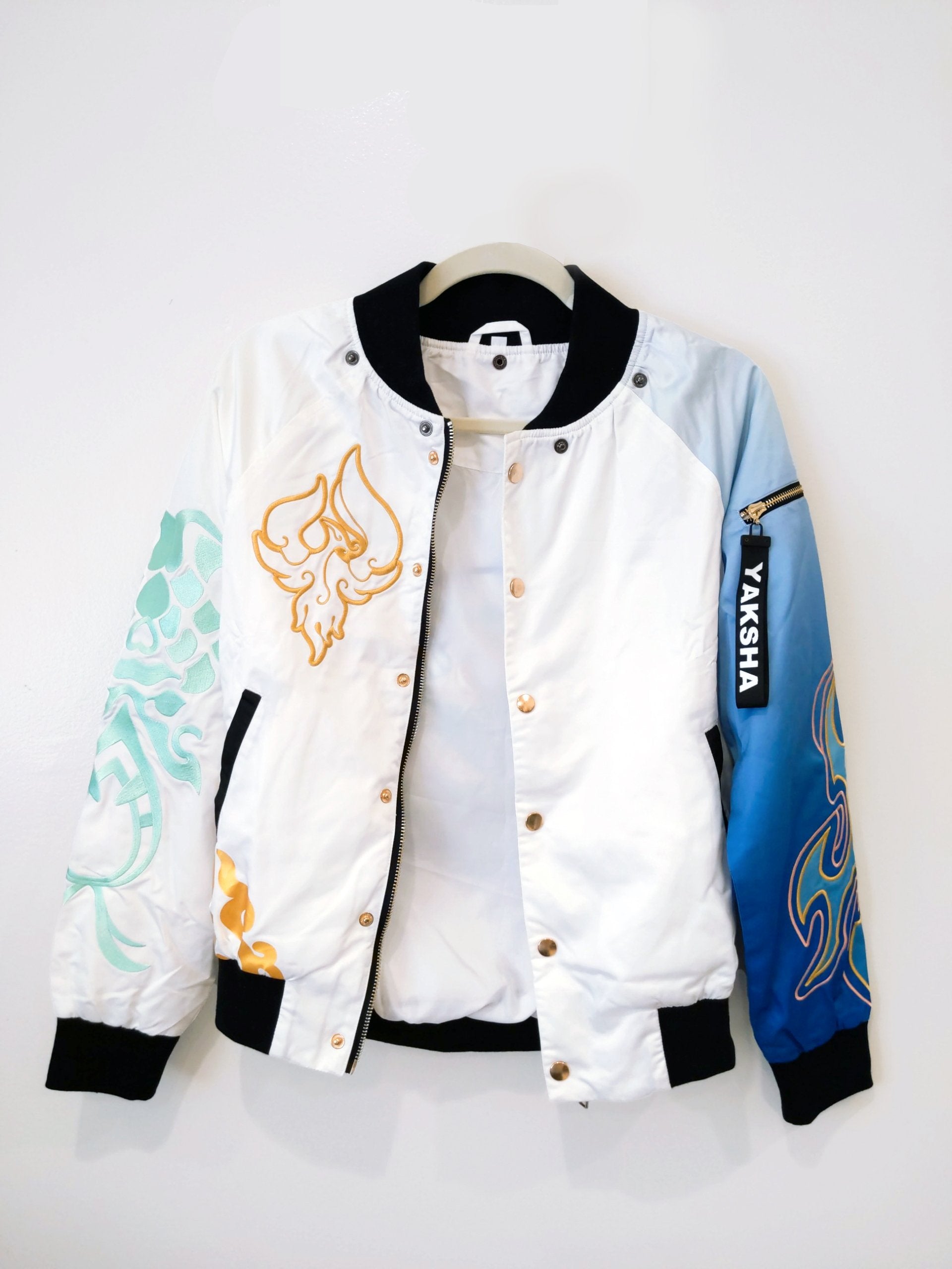 A sukajan (スカジャン), also known as a "souvenir jacket", is a type of outerwear originally inspired by baseball jackets and that feature a characteristic embroidered style. This bomber jacket is based off of the character Xiao from Genshin Impact!